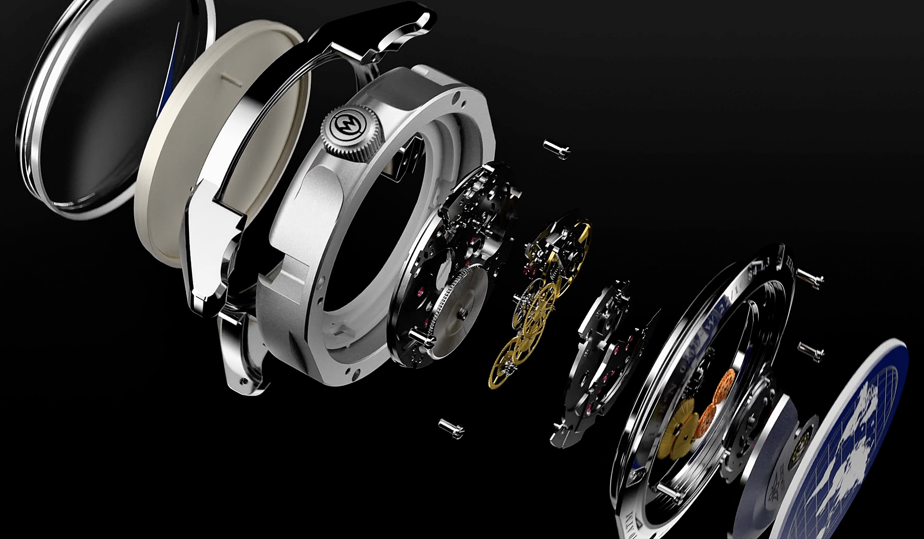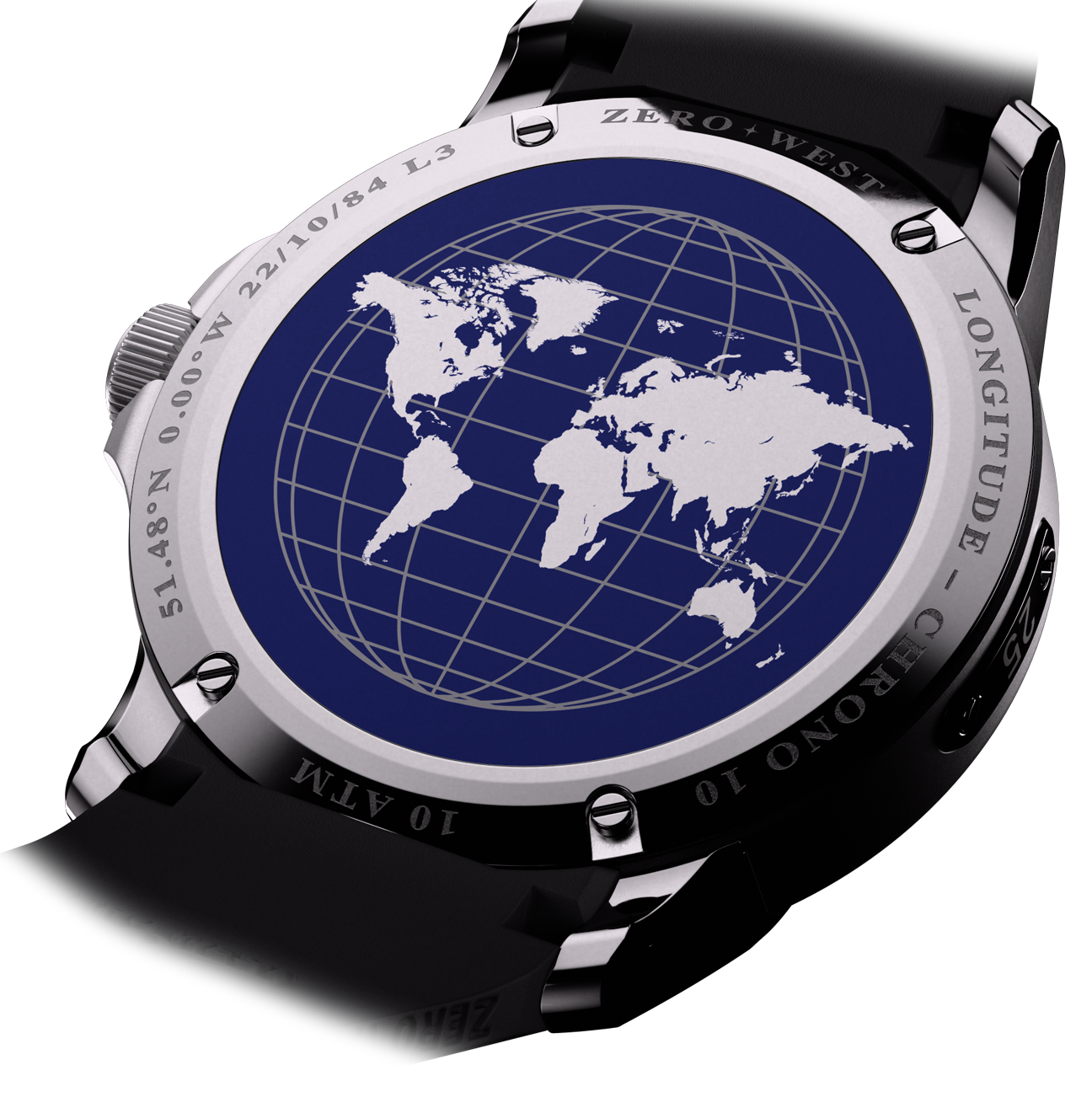 Every L3 Longitude displays the world on its back. Our in-house R&D team reverse-prints the sapphire with a deep-navy globe and meridian lines, placing the Prime Meridian at your centre – a refined salute to British horology and the spirit of the L3.