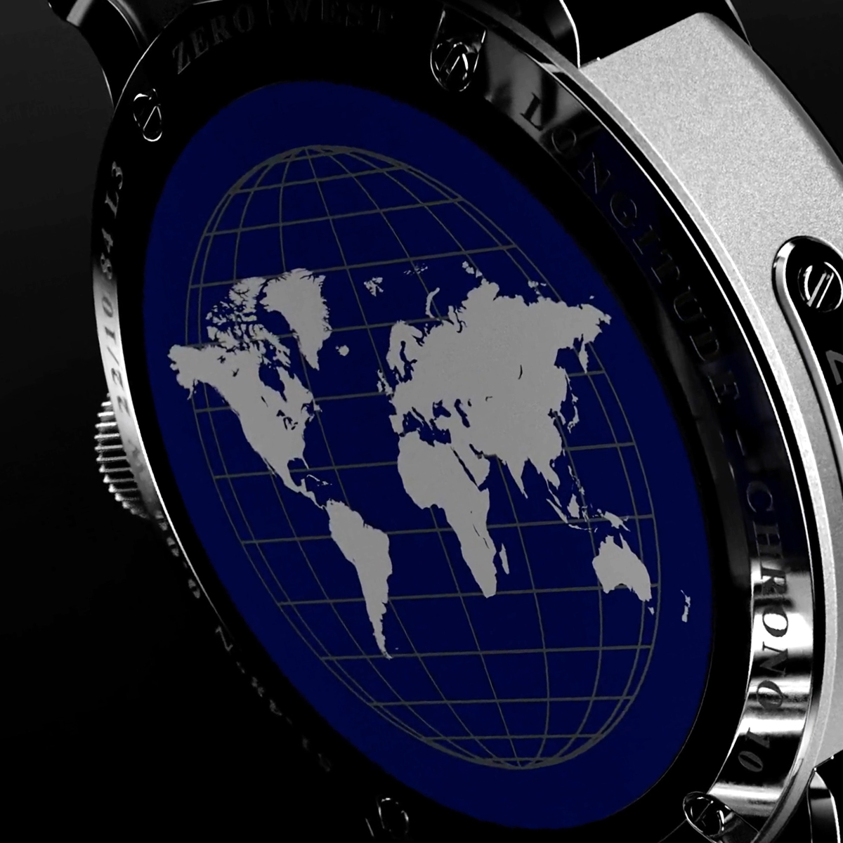 Every L3 Longitude displays the world on its back. Our in-house R&D team reverse-prints the sapphire with a deep-navy globe and meridian lines, placing the Prime Meridian at your centre – a refined salute to British horology and the spirit of the L3.