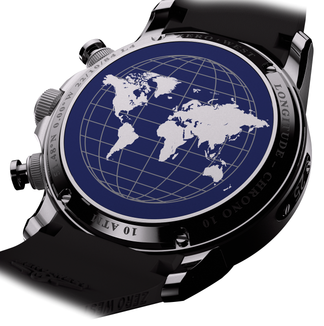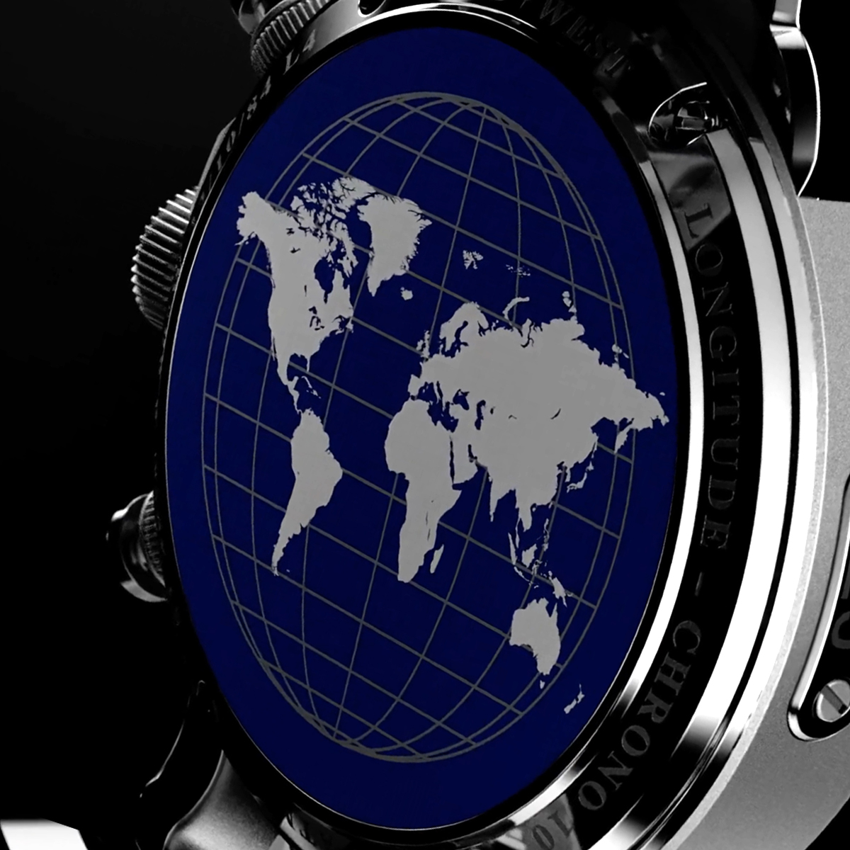 Every L4 Longitude displays the world on its back. Our in-house R&D team reverse-prints the sapphire with a deep-navy globe and meridian lines, placing the Prime Meridian at your centre – a refined salute to British horology and the spirit of the L4.